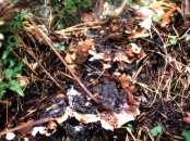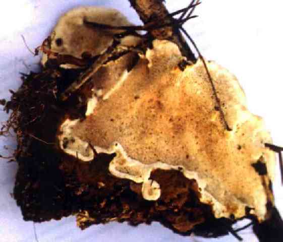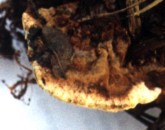 Корневая губка - Fomitopsis annosa (Fr.) Karst. Пихта Корневая губка вызывает пеструю волокнистую гниль корней и основания ствола пихты сибирской. Большинство исследователей называют ее основным виновником корневых (комлевых) гнилей в пихтовых насаждениях. Вызываемая корневой губкой гниль распространяется по стволу пихты до 11 м, в среднем - 6 м. Потери деловой древесины у этой малосмолистой породы составляют 78 %. Плодовые тела гриба у старовозрастных пихтовых деревьев обычно встречаются между корневыми лапами у основания стволов. В Западной Сибири корневая гниль пихты встречается в той или иной степени во всех типах пихтачей. Деревья пихты, пораженные корневой губкой, распространены в основном диффузно - в этом случае степень зараженности пихтачей не превышает 10 %, повышаясь с возрастом. Однако в равнинной тайге, на Салиаре и Алтае патоген имеет тенденцию к образованию очагов и зараженность доходит местами до 50 % и более. Очаги корневой губки в расстроенных рубками насаждениях приводят местами к вываливанию ветром пораженных корневой гнилью деревьев. В Южном Приобье корневой губкой в большей степени заражены пихтовые насаждения с близким выходом грунтовых вод, т. е. достаточно увлажненные. Отмечается также большее распространение корневой губки в пихтачах, развивающихся на лучших почвах, в оптимальных температурных и влажностных условиях. Значительный процент деревьев, зараженных корневой губкой, имеют перестойные насаждения, а также насаждения, имеющие в своем составе только пихту. Заражение пихты корневой губкой может произойти уже в 20-30 лет, однако, в основном ею поражаются старые древостои. В незначительной степени заражены пихтачи, растущие в верхних частях таежно-черневого и в горно-таежном поясах в смеси с лиственными породами, а также не достигшие 80 лет. Пихтачи, произрастающие на почвах карбонатных, с близким выходом известняков корневой губкой заражены незначительно. Пихтовые леса Алтая в нижней части горных склонов значительно сильнее заражены корневой губкой, чем в средней и верхней частях гор. По мере подъема в горы наряду с изменением производительности пихтовых древостоев снижается также и процент зараженности пихты напенной гнилью (с 80 % до 30 % в субальпийских редколесьях). Однако четких закономерностей появления корневой губки в насаждении и зависимости степени заражения от условий произрастания не найдено. Прослеживается зависимость между возрастом насаждения и зараженностью корневой губкой, протяженностью гнили в стволе, ее объемом по диаметру. В целом процент зараженности пихтачей корневой губкой по регионам значительно варьирует. Эти расхождения в большинстве своем связаны с различиями пихтачей по типологии, возрастной структуре и состоянию. Однако чаще всего степень зараженности пихтачей корневой губкой связана с захламленностью, наличием сухостойных деревьев, а также бесхозяйственными рубками, приводящими к расстроенности насаждений. К описанию гриба |