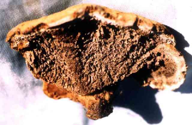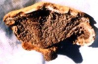 Еловый трутовик - Polystictus circinatus (Fr.) Karst. var. triqueter Bres. Ель Гриб вызывает ямчатую сердцевинную или центральную гниль стволов ели, приближающуюся к периферии там, где образуются плодовые тела, поражающую заболонь и умерщвляющую на значительном пространстве камбий. Гниль, обычно начинающаяся в нижней части ствола, поднимается вверх на высоту до 6 м, а, спускаясь вниз, проникает в корни, где распространяется весьма интенсивно как по диаметру, так и по длине (до 2 м). В III стадии гниль характеризуется пустотами, заполненными белой грибницей, и трещинами по годичным слоям, заполненными коричнево-черными неветвящимися шнурами. При большой давности заражения, когда плодовые тела располагаются группами на стволе на протяжении 1-1,5 м от корневой шейки, из пораженных деревьев можно получить только рядовые пиловочные бревна. Загнивание корней вызывает общее угнетение деревьев, засыхание их и заселение короедами, а также неустойчивость их против ветров и буреломов. После отмирания деревьев гриб продолжает жить на сухостое или пнях, поражает также заготовленную древесину. К описанию гриба |